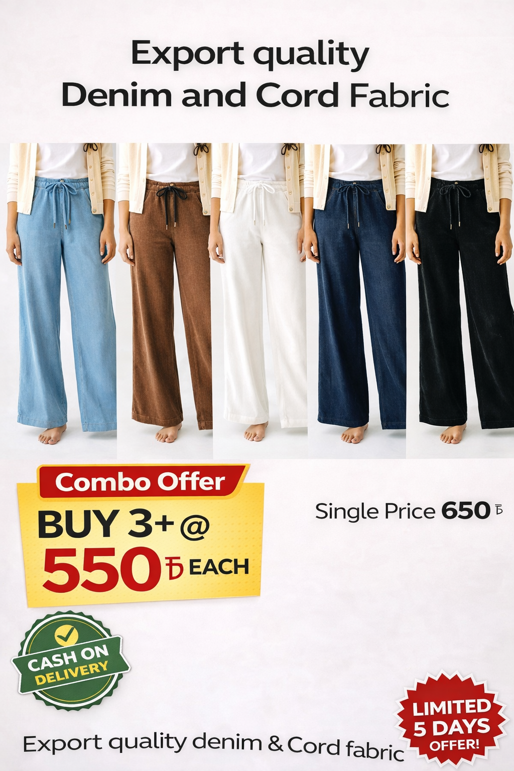 • ফ্যাব্রিক: প্রিমিয়াম কোয়ালিটি ডেনিম AND সফট কর্ড (Corduroy)